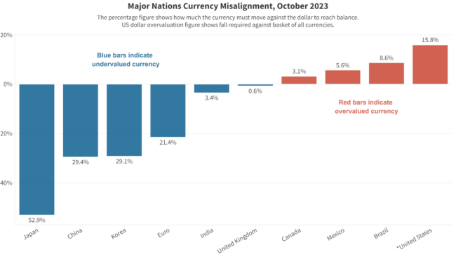 The October Currency Misalignment Monitor shows that dollar overvaluation rose yet again last month, reaching 15.8% against the basket of 33 other currencies included in our model.