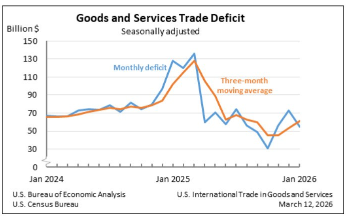 “Tariffs are flattening the growth of goods imports, but against that the massive spend on data centers led to January computer imports up 100% (on a year-on-year basis) and telecom equipment up over 50%. Still, more action needs to be taken to drive down the trade deficit and drive up U.S. production,” Ferry said.