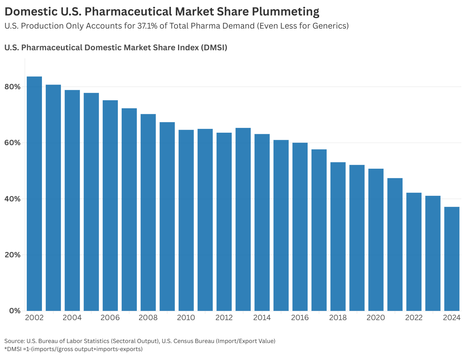 U.S. pharmaceutical domestic market share collapsed from 83.7% in 2002 to just 37.1% by 2024.