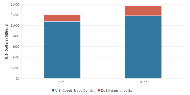 De minimis China imports increases the 2022 U.S. goods trade deficit by 16% to $1.38 trillion, representing some 8.3 million lost U.S. jobs.