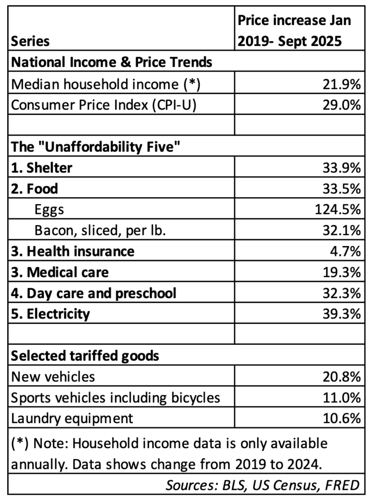 Compared to the Unaffordability Five, tariff-impacted prices are very moderate. Table 1 shows three categories of goods that are tariffed: new vehicles, bicycles, and laundry equipment (washing machines). All three are tariffed, vehicles directly with 25% tariffs, bicycles with the “reciprocal” tariffs on import sources like China, Taiwan, and Cambodia, and washing machines based on the steel they contain. Yet all three show price increases below the 2019-2025 increase in the general CPI and median household income.