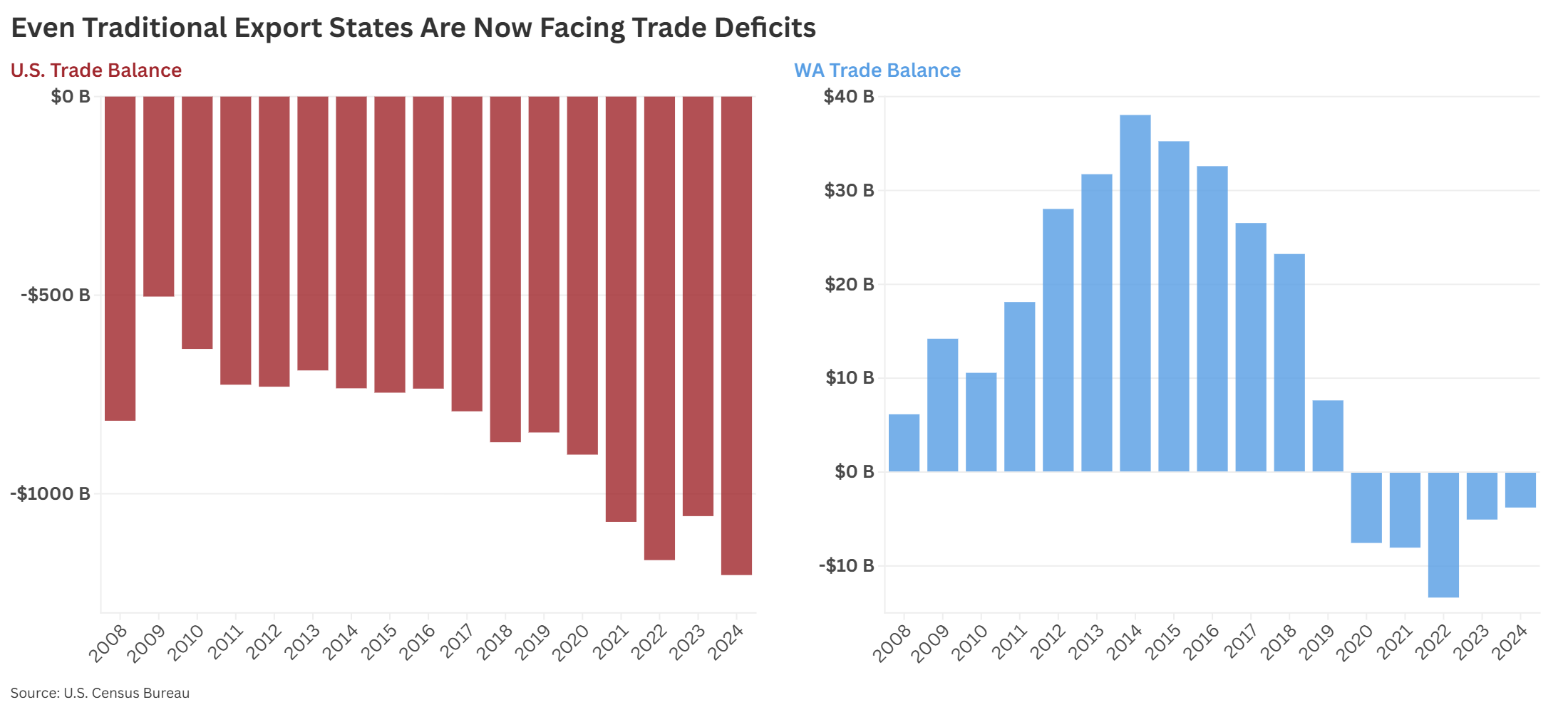 As shown in Figure 1, the U.S. trade deficit continues to widen under our open trade regime, and even states like Washington—whose exports have traditionally been bolstered by Boeing sales—have now been caught in the same free trade trap, with foreign producers outpacing any gains for U.S. business.