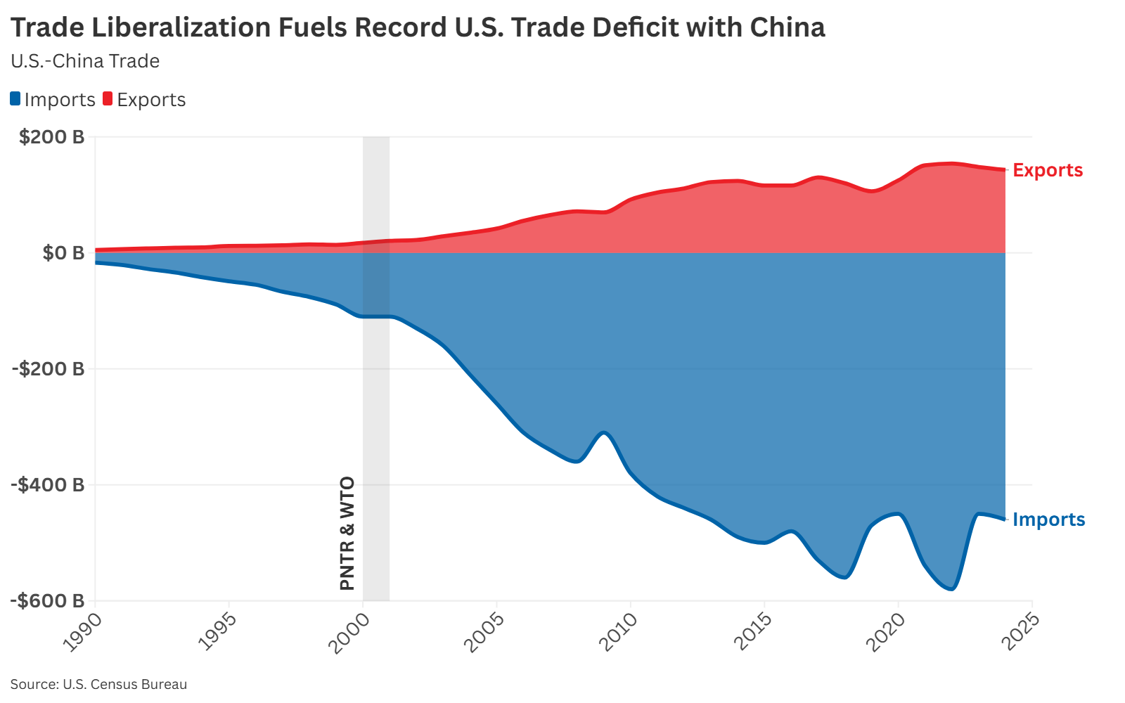 Rather than opening its doors to a flood of U.S.-made goods, China became a platform for exporting cheap, often subsidized products into the U.S. market. As shown in Figure 2, this did not result in balanced trade, but a ballooning goods trade deficit exceeding $319 billion in 2024.
