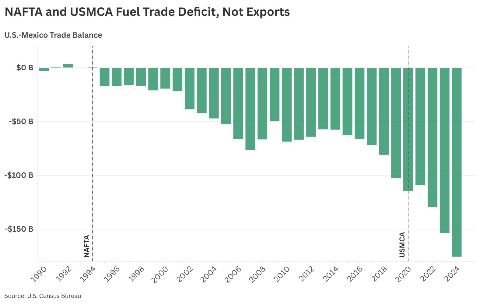 Clinton was also responsible for pushing NAFTA’s implementation in 1994, promising prosperity through trade with Canada and Mexico. What followed was a familiar pattern: ballooning deficits, outsourcing, and industrial decline. The U.S.-Mexico goods trade deficit is now at $176 billion as Mexico became a production hub for autos, electronics, steel, food, and more. Meanwhile, working Americans watched their wages stagnate and factories shutter.