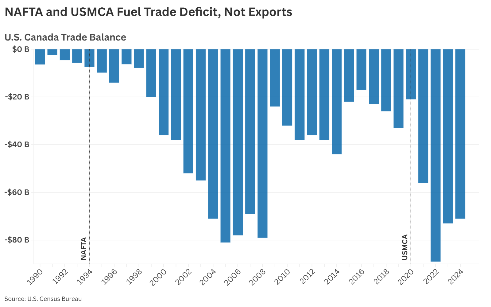 Yet even with decades of evidence of decline, U.S. politicians keep pushing for more open trade with Mexico and Canada. Senator Mike Crapo (R-Idaho) recently stated, “The almost $1 trillion exchanged in trade between the U.S. and Canada in 2023 powers 8 million U.S. jobs.” But this exchange is far from balanced. Canada continues to export far more to the U.S. than it imports in return—resulting in a persistent U.S. trade deficit ($71.4 billion in 2024) and a quiet erosion of U.S. industrial independence.