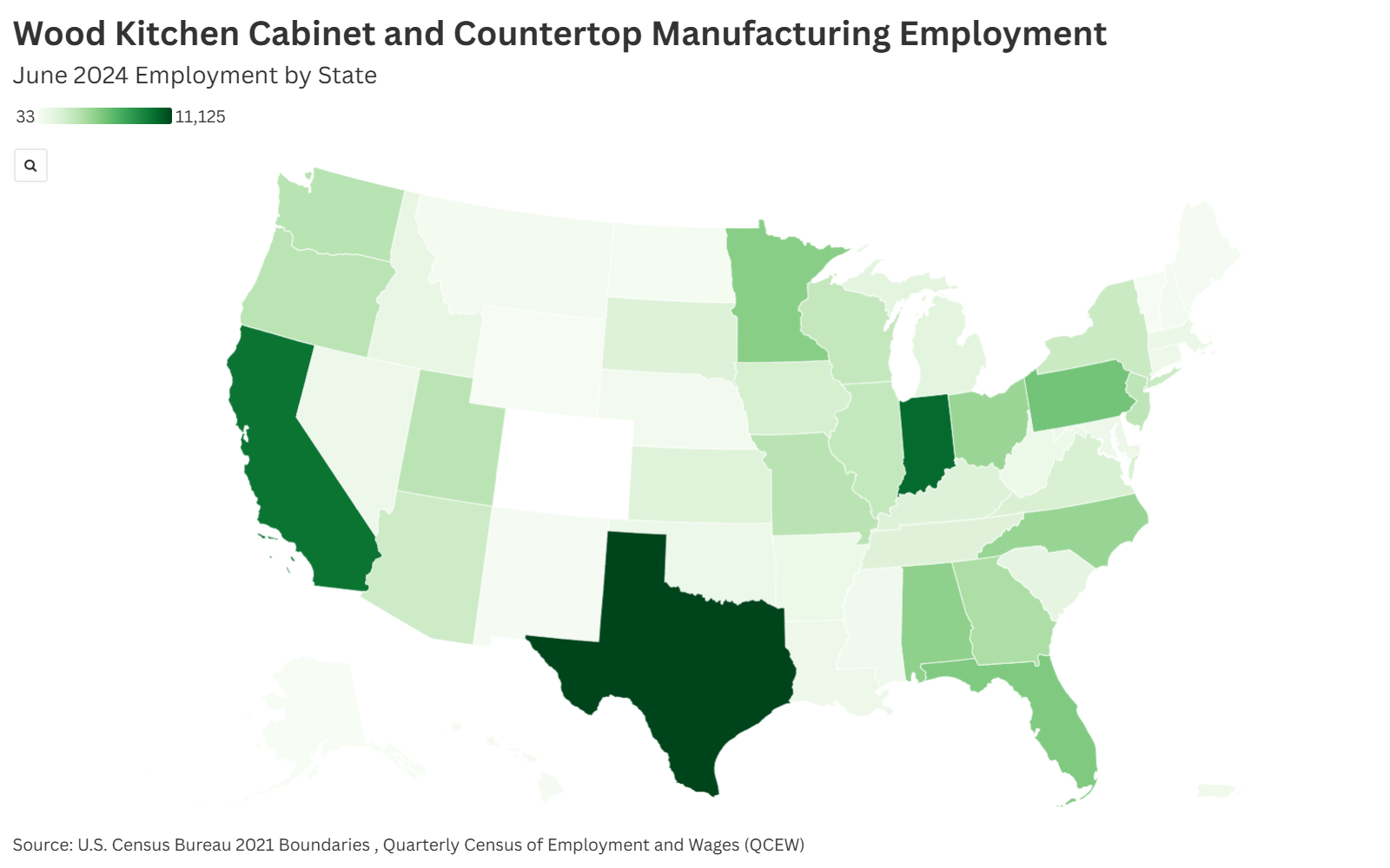 Moreover, the American Kitchen Cabinet Alliance highlights how 40% of the over 250,000 kitchen cabinet industry jobs come from underserved communities, demonstrating the industry’s vital role in providing employment and economic stability to a broad range of workers. The industry has a strong presence in a wide range of states, with the largest number of employees in Texas, Indiana, California, Pennsylvania, North Carolina, Alabama, and Florida as shown by Figure 1.