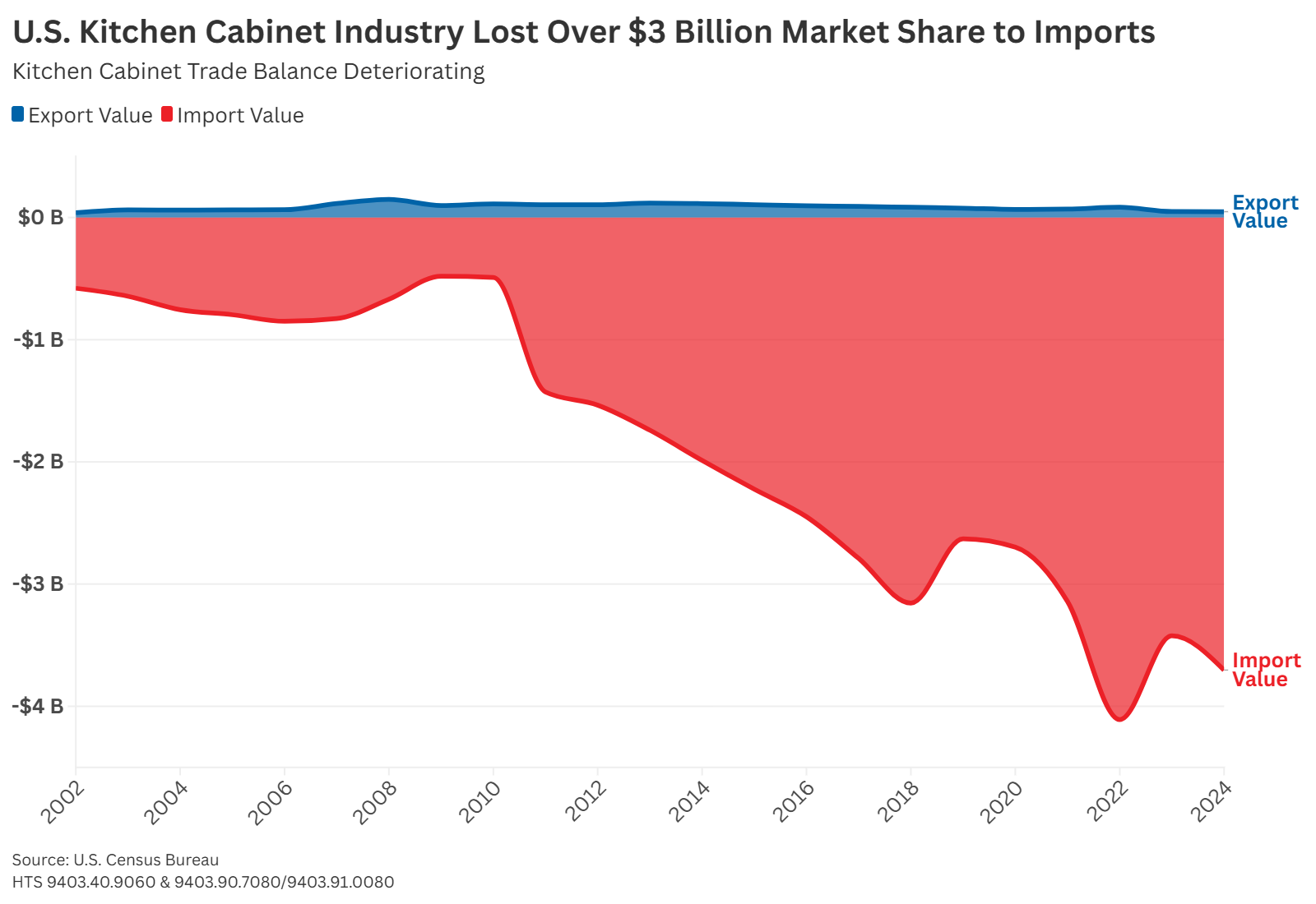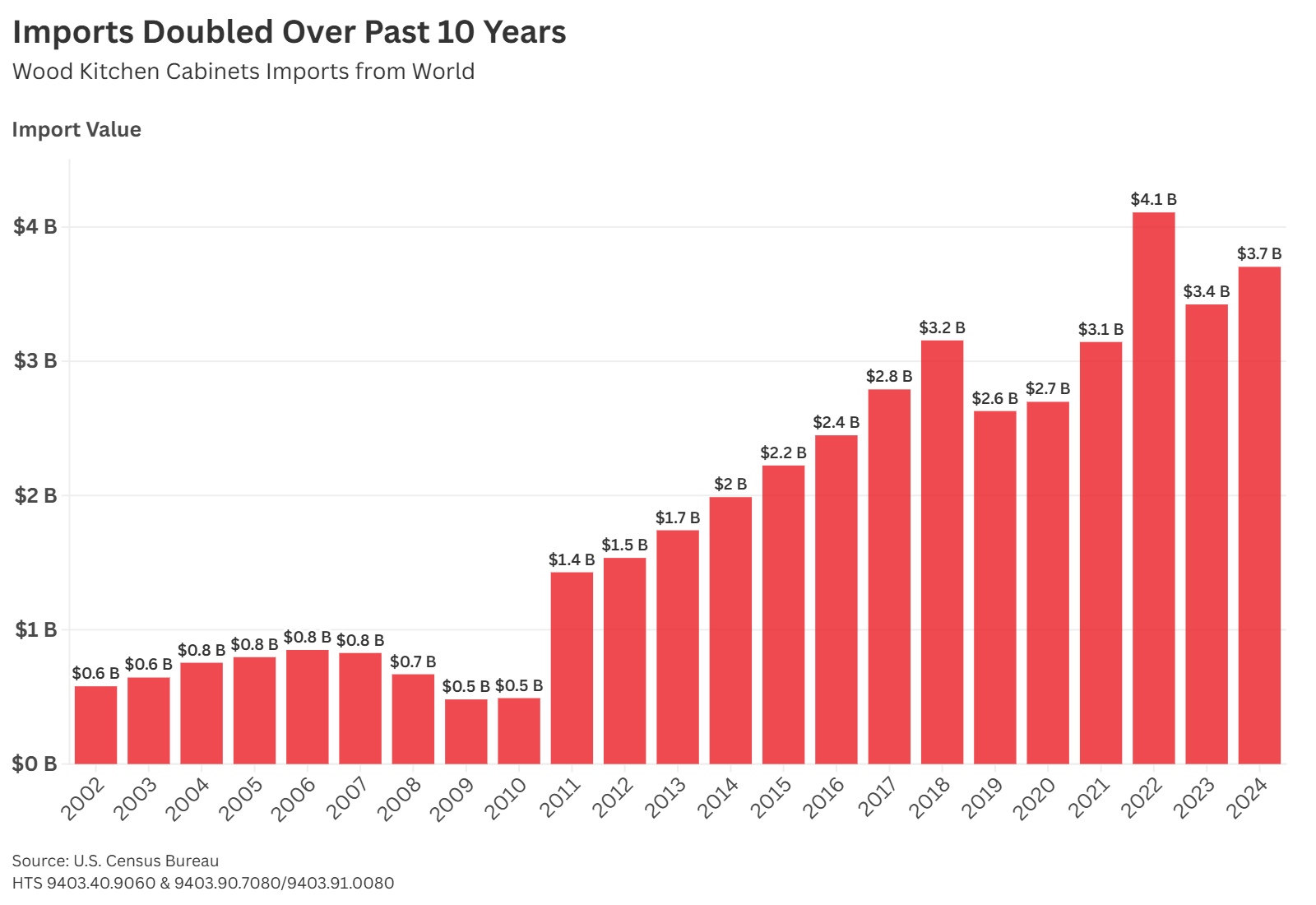As shown in Figure 2, U.S. imports of wood kitchen cabinets have surged in recent years. Total imports reached $3.7 billion in 2024, more than double import levels 10 years ago.