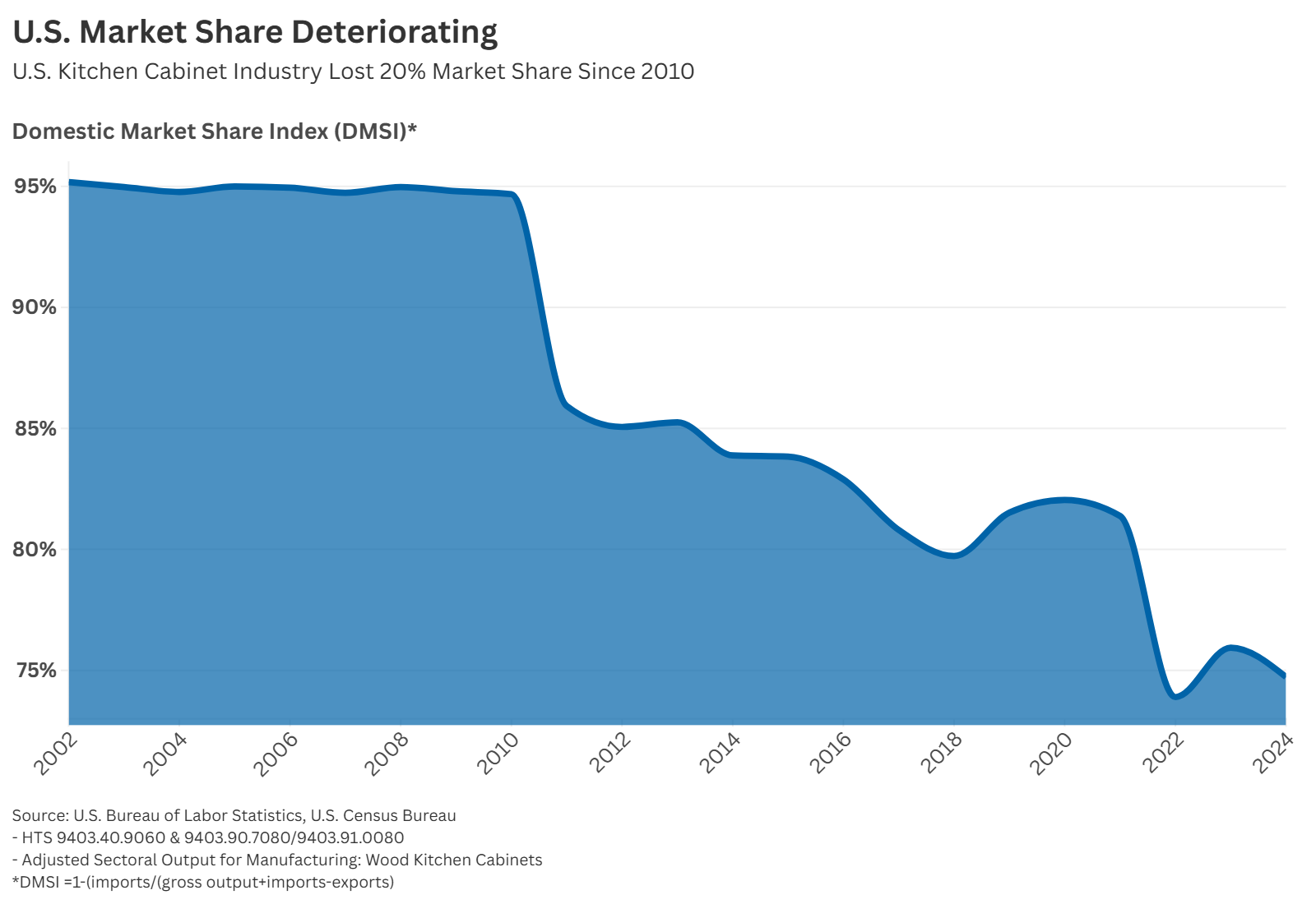 The combined import surge and growing damage to U.S. kitchen cabinet producers has cumulated in a diminishing U.S. market share. As foreign producers control more and more of the U.S. market, the benefits for U.S. businesses and workers have also declined. As shown in Figure 3, in the past 10 years, U.S. producers have lost 20% domestic market share since 2010 due to rising imports and a growing intrusion of foreign producers into the U.S. market.