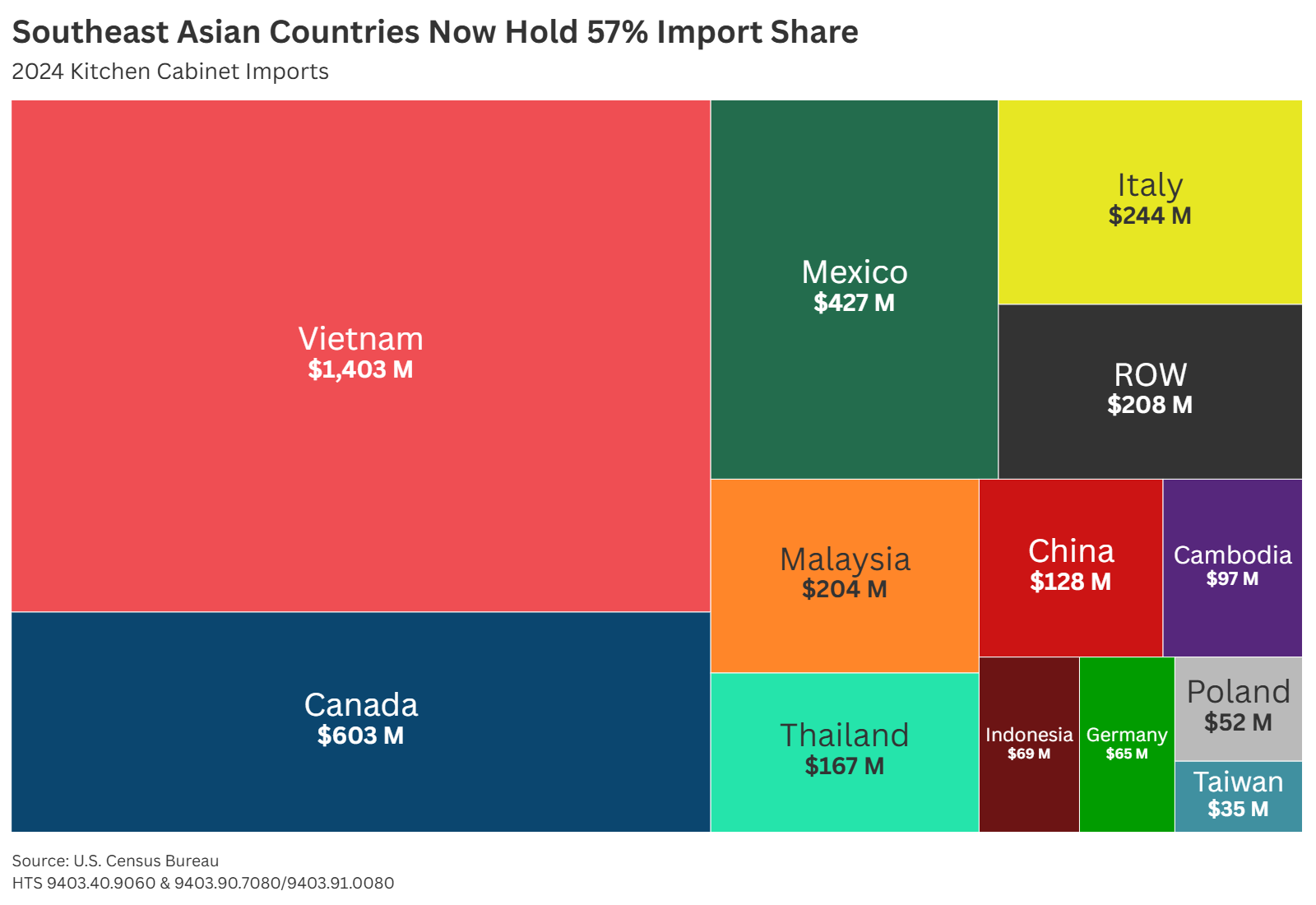 The Section 301 China tariffs and antidumping case did curb direct imports from China, but this merely shifted the surge to other countries, notably Southeast Asia and Mexico. As shown in Figure 6, Southeast Asian countries including Vietnam, Malaysia, Thailand, Cambodia, Indonesia, and Taiwan now make up 57% of the U.S.’s total kitchen cabinet imports, and Mexico holds an additional 10%.
